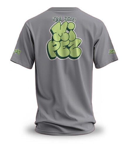Todo comienza en el pecho con una versión compacta y nítida del graffiti «¡Qué Dice, Mi Pez!». Es una pista, un guiño de complicidad que demuestra tu buen gusto y tu conexión con la cultura de la calle. Es el detalle que inicia la conversación.