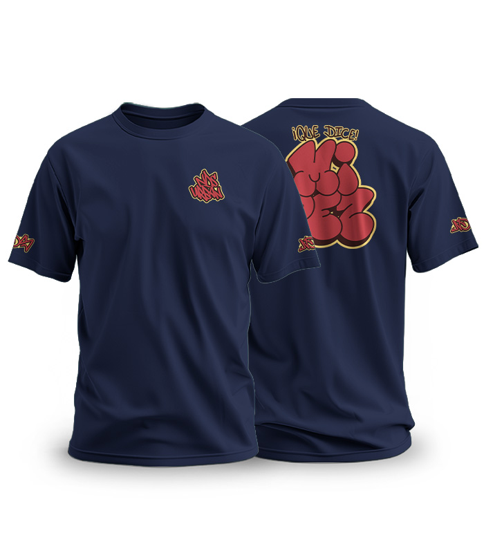 Pero es en la espalda donde se revela el verdadero calor. El graffiti «¡Qué Dice, Mi Pez!» cobra vida en su versión más apasionada: el color magma. Tonos rojos intensos y contornos encendidos que gritan «amistad a prueba de fuego». Es un saludo que no solo conecta, sino que celebra la fuerza de un lazo inquebrantable. Como siempre, las firmas en las mangas completan el look.