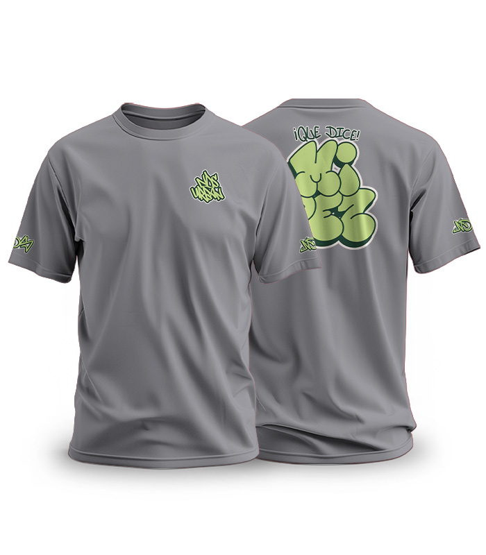 Pero es al dar la espalda cuando compartes la verdadera energía. El graffiti «¡Qué Dice, Mi Pez!» cobra vida en el fresco y vibrante color pasto. Es un saludo que evoca días soleados, parches relajados y la autenticidad de una buena conversación entre amigos. Es la buena vibra hecha arte, una declaración de amistad que deja una estela de frescura. Como siempre, las firmas en las mangas completan el look.